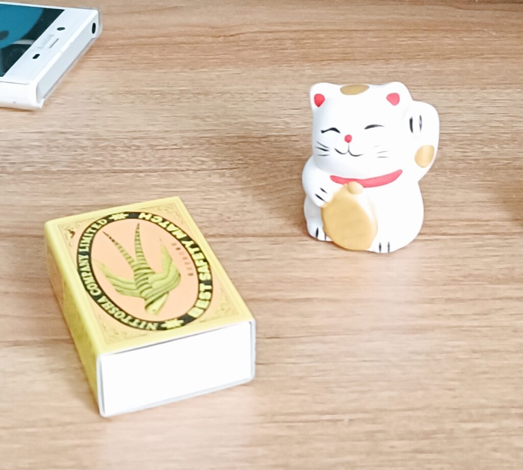 最近のお気に入りは、お正月に買った招き猫。これを目に付くところに置いています。